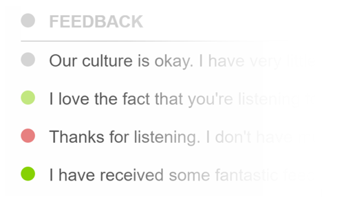 With Feedback Tone from Incogneato, you can get an instant pulse of how your respondents are feeling. Incogneato automatically scans the words, sentences, and phrases used in the feedback to determine it’s tone. A color is then assigned and displayed right beside the feedback.