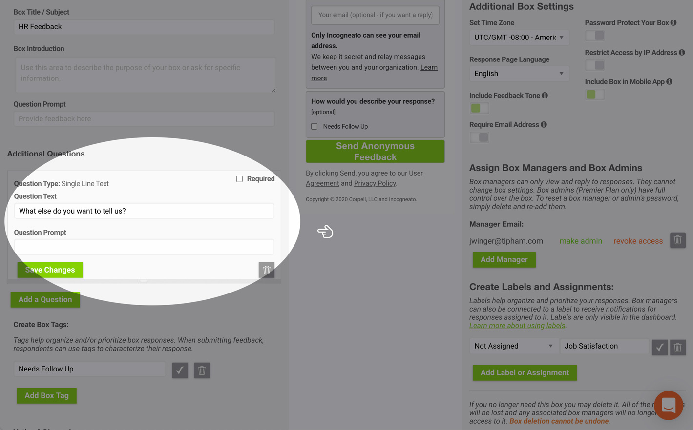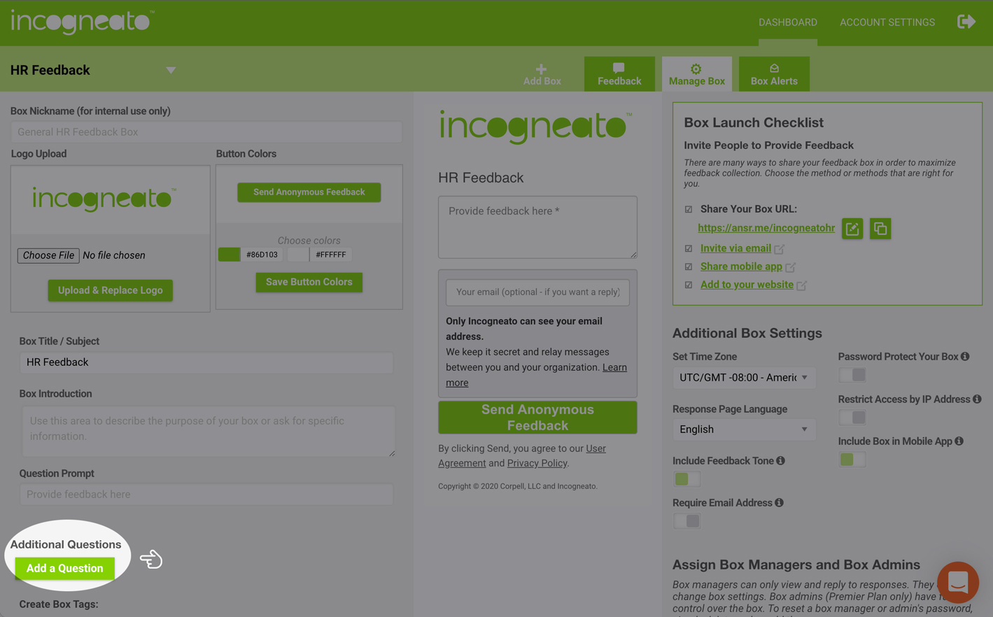 Log in to your account, navigate to the Manage Box screen, and click the Add a Question button on the left side of the screen. A form will appear where you can add your new question. Premier Plan customers can add up to 25 questions to each box. Professional Plan customers can add up to 4.