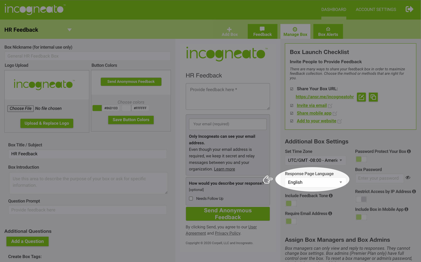 Log in to your account, navigate to the Manage Box screen, and use the Response Page Language dropdown field to select your desired language (current options include Spanish, German, French, Italian, Dutch, Portuguese, or English).