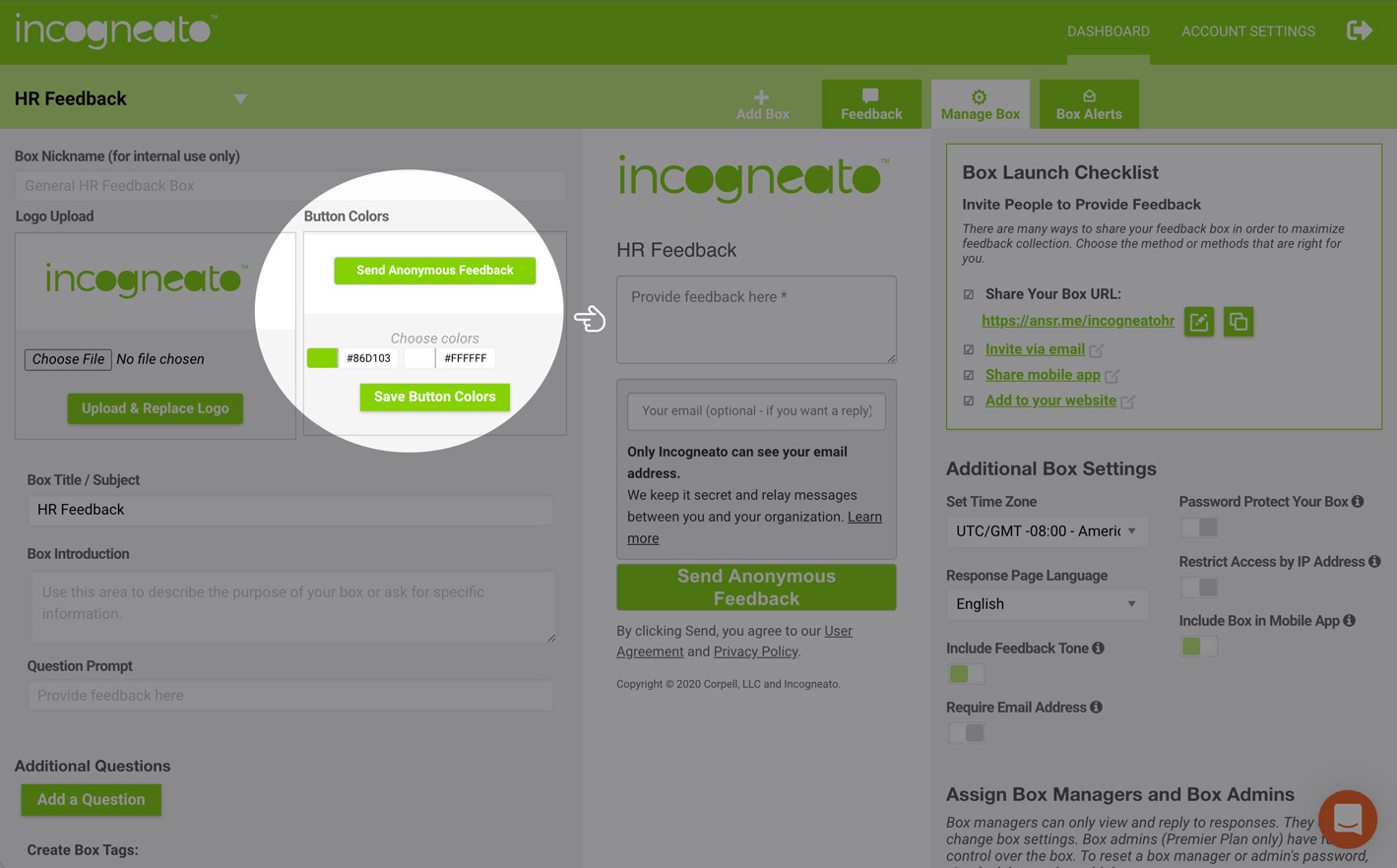 Log in to your account, navigate to the Manage Box screen, and click on either of the color boxes in the Button Colors box. You will then be able to select a color with a color picker or enter a HEX color code for both the background and text of the button of your feedback box.