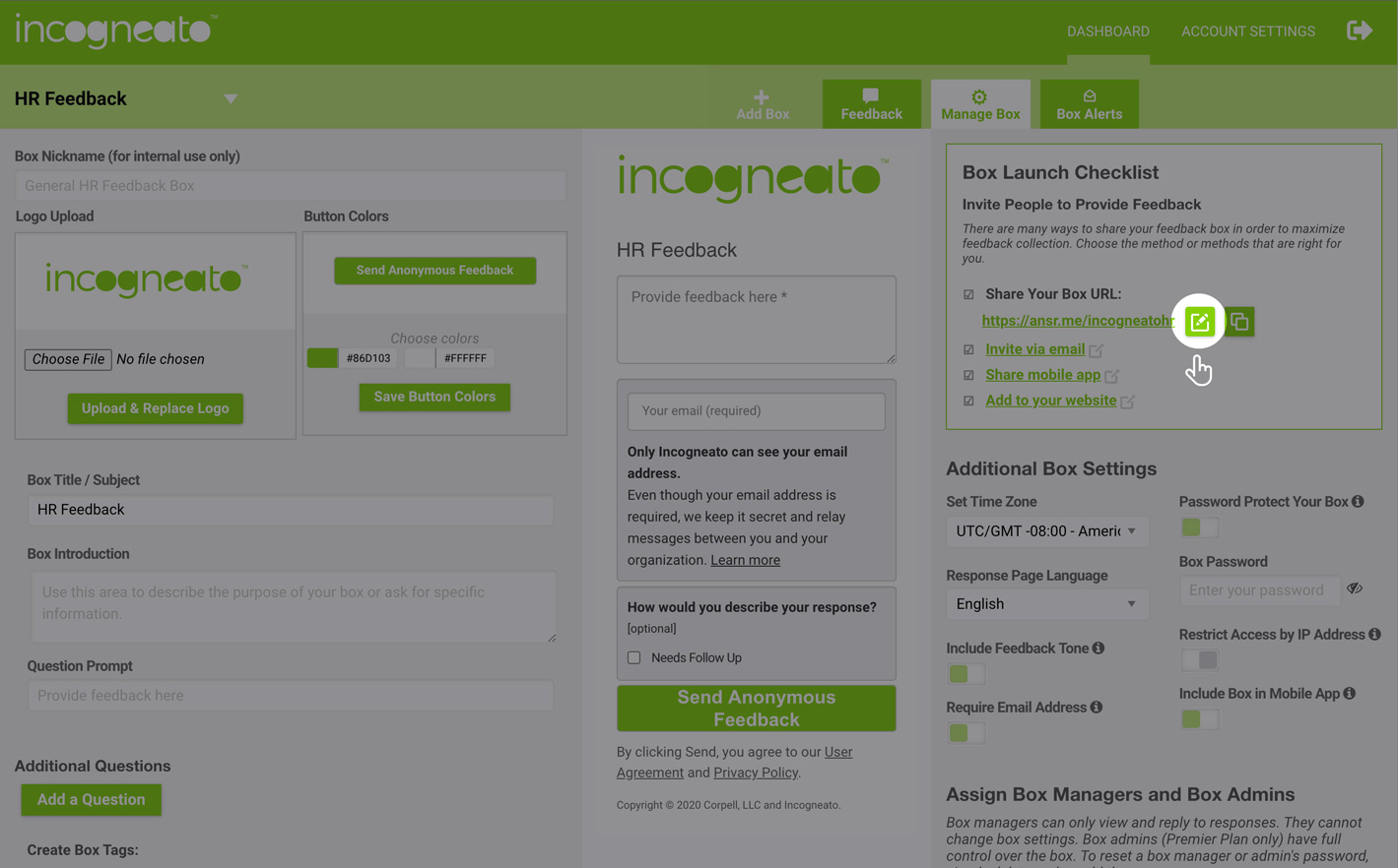 Log in to your account, navigate to the Manage Box screen, and find your "Box Launch Checklist" box. Inside you'll find your current box url and next to it an icon you may click to edit the last portion of the url within the ansr.me domain. Click the check mark icon to save your changes. If the custom url you have entered is available, it will be updated within seconds.