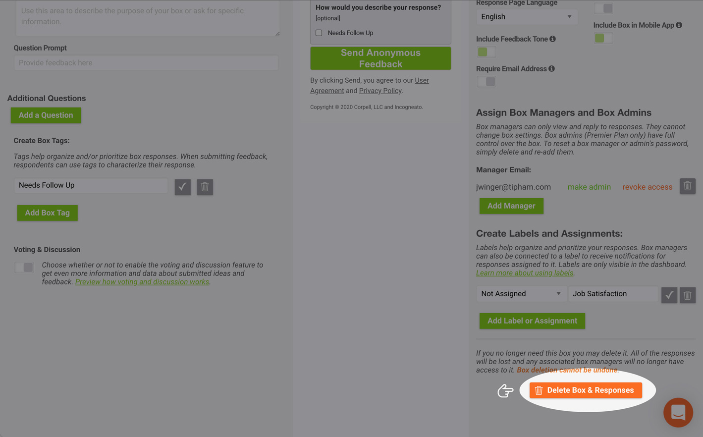 Once you have selected the correct box, navigate to the Manage Box screen, and find the Delete Box and Responses button in the lower right portion of the screen. Note: in order to delete a box, you must have at least two boxes in your account. Additionally, please note that box deletion cannot be undone.