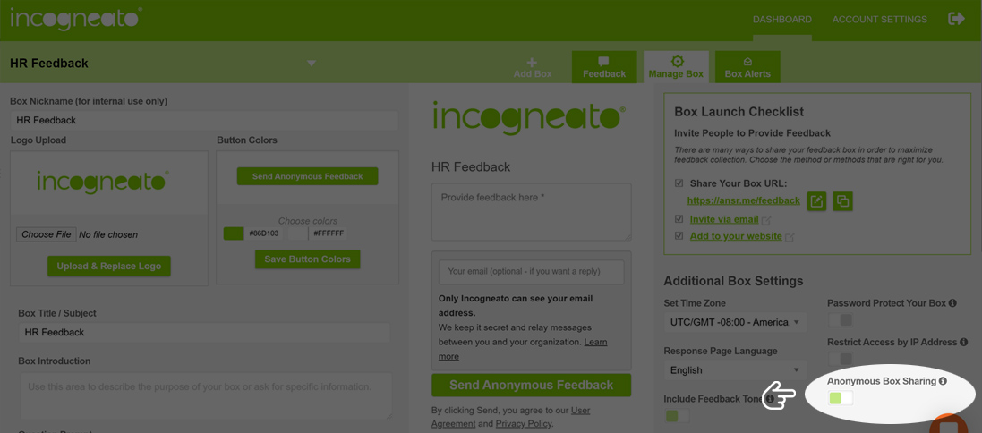 Log in to your account, navigate to the Manage Box screen, and find the Anonymous Box Sharing toggle in the right sidebar. Clicking the toggle will enable or disable anonymous box sharing. Note: we recommend keeping this enabled because it will likely increase the amount of feedback you receive.