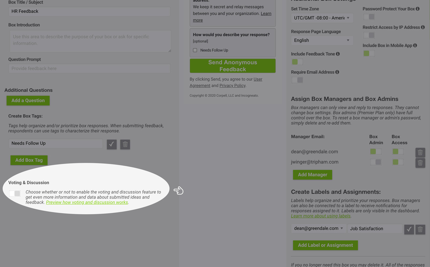 Log in to your account, navigate to the Manage Box screen, find the Voting & Discussion area in the lower left portion of the screen. Click the toggle button to enable the feature. Voting and discussion are immediately enabled for your box.