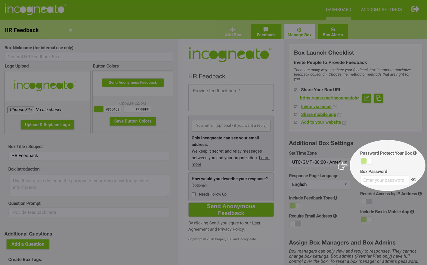 Log in to your account, navigate to the Manage Box screen, and find the Password Protect Your Box toggle in the right sidebar. Clicking the toggle will enable password protection and prompt you to enter your desired box password. Be sure to remember this password as you'll have to give it to those from whom you would like collect feedback.