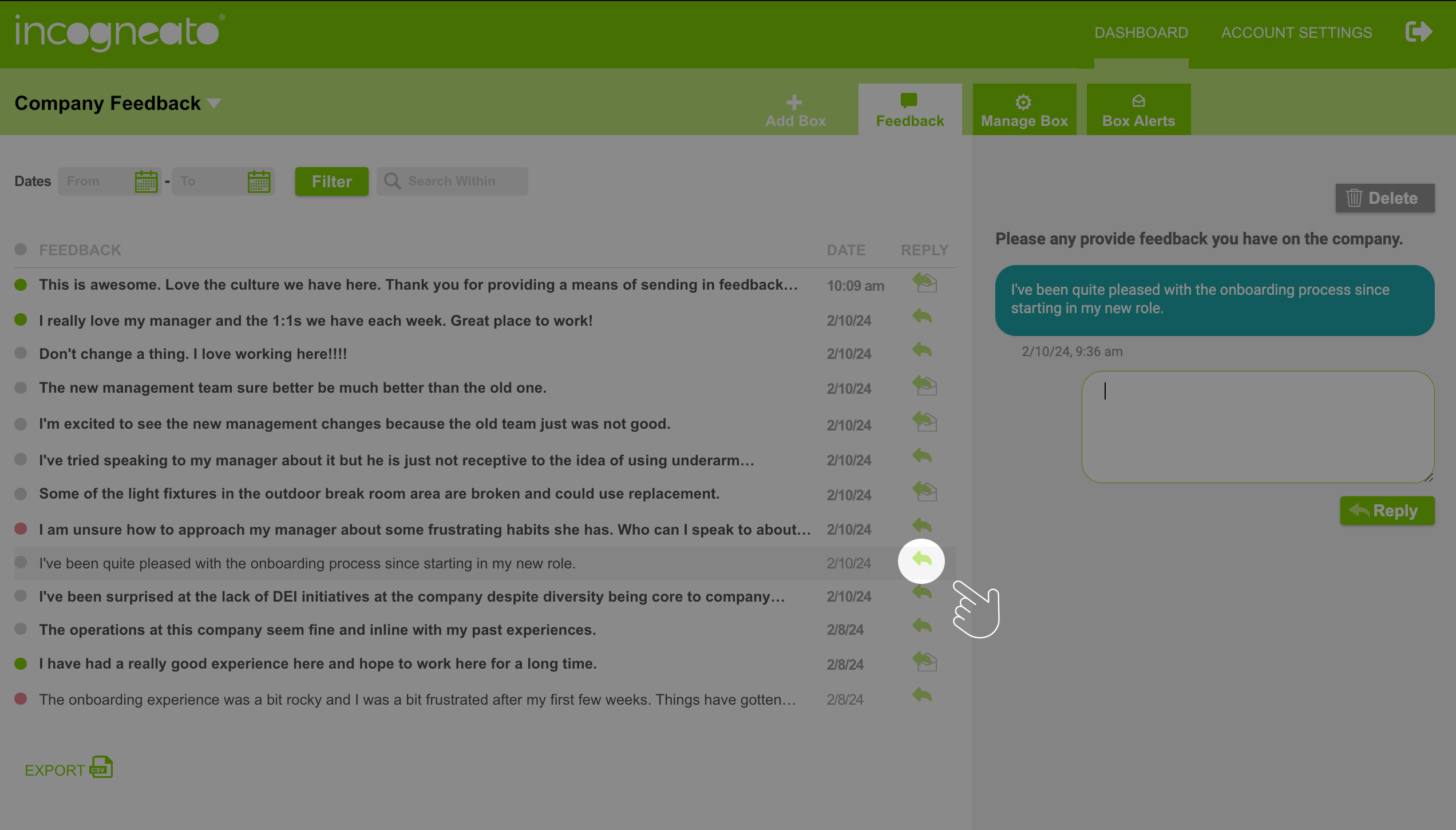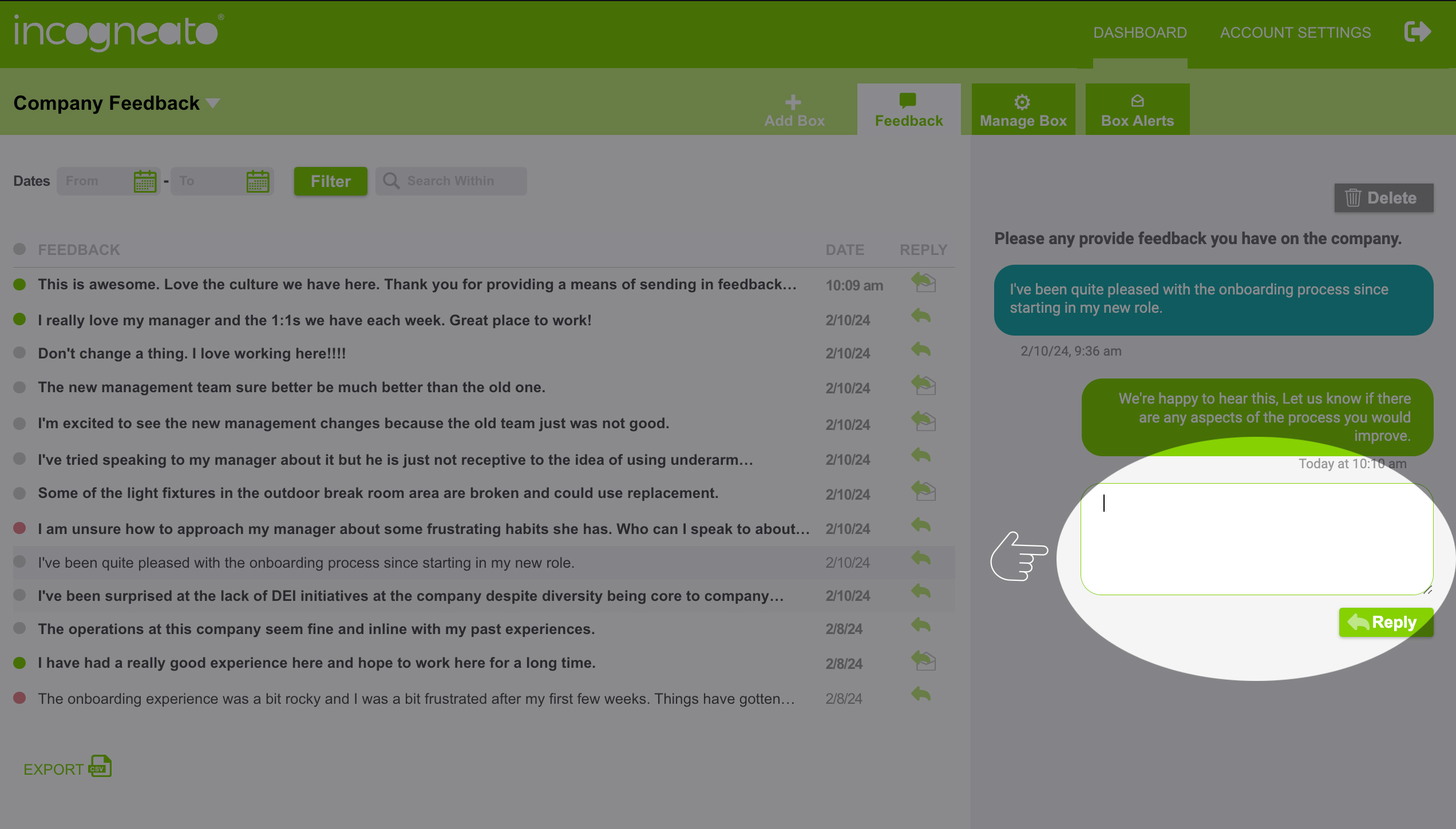 Click on the feedback and it will load into the right sidebar. Type your reply and click the Reply button. Your conversation will appear here.