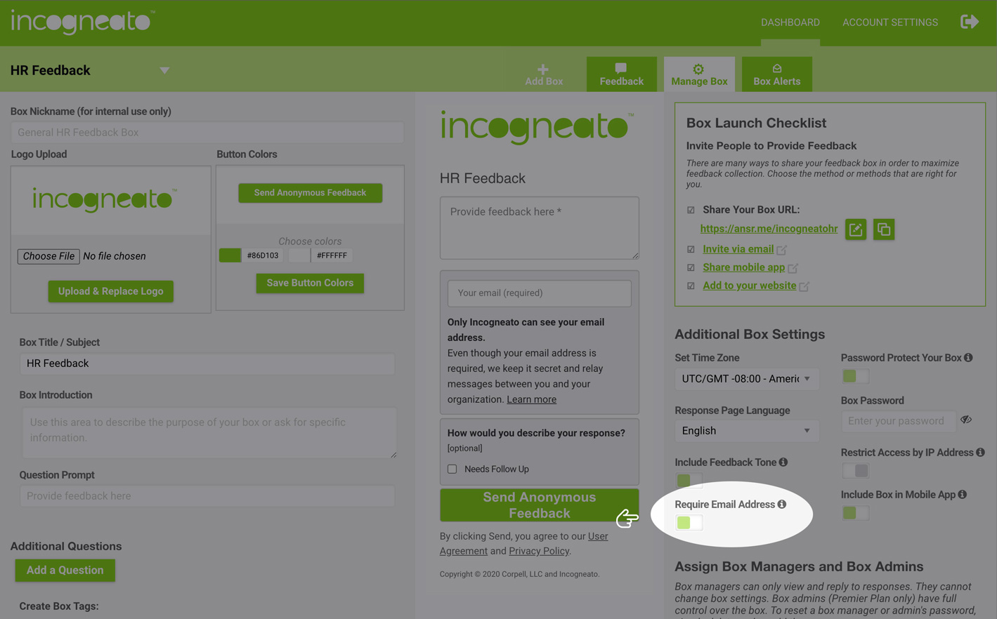 Log in to your account, navigate to the Manage Box screen, and find the Require Email Address toggle in the right sidebar. Clicking this toggle will turn this feature on and/or off.