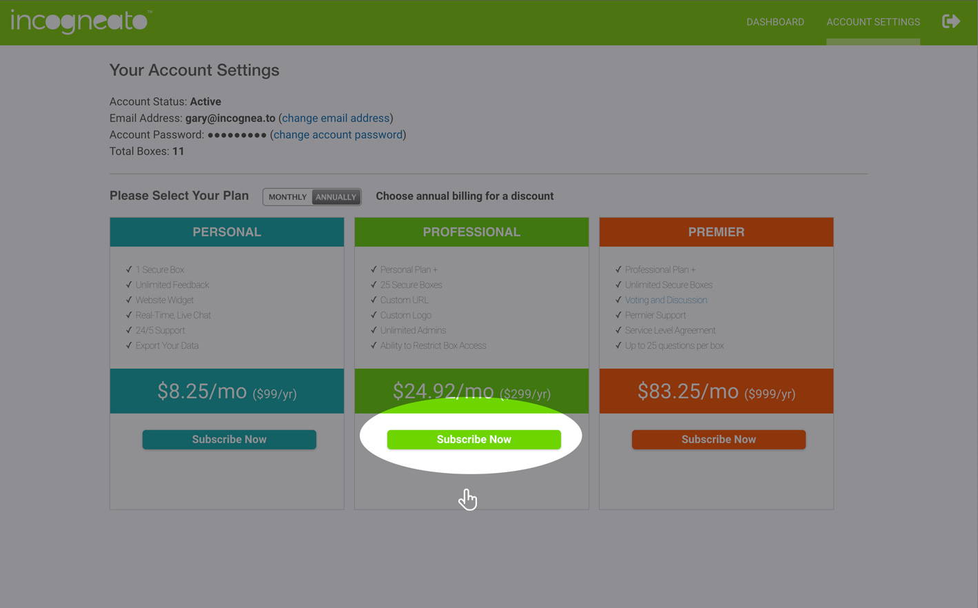 Log in to your account and click Account Settings at the top of the screen. Scroll down to the Please Select Your Plan section and choose your desired plan. After entering your payment information, it may take up to 1 minute for your chosen plan to take effect.