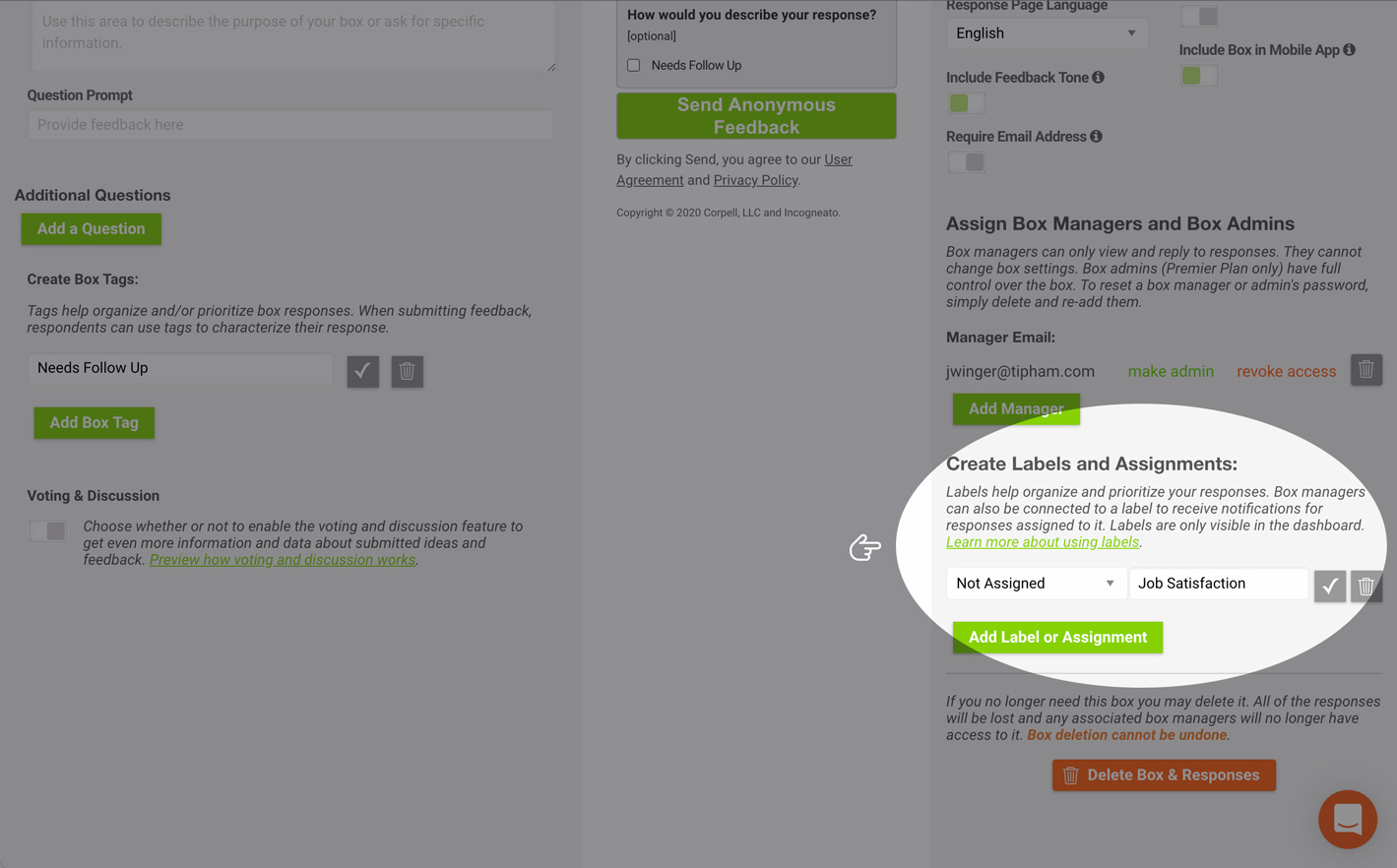 Log in to your account, navigate to the Manage Box screen, and find the Create Labels and Assignments section in the right sidebr. You can create new labels or modify your existing ones here. You can also (optionally) link a box manager to a label. When linked, the box manager receives a notification when feedback is assigned to their label.
