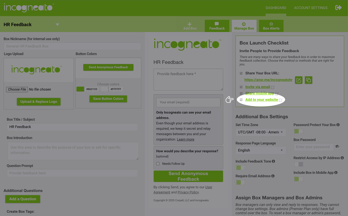 Login to your account, navigate to the Manage Box screen, and find the Add to your website link at the bottom of the Box Launch Checklist box. Click this link and a new window will open with your unique widget code. Copy/paste the code directly below the opening <body> tag in your website’s html.