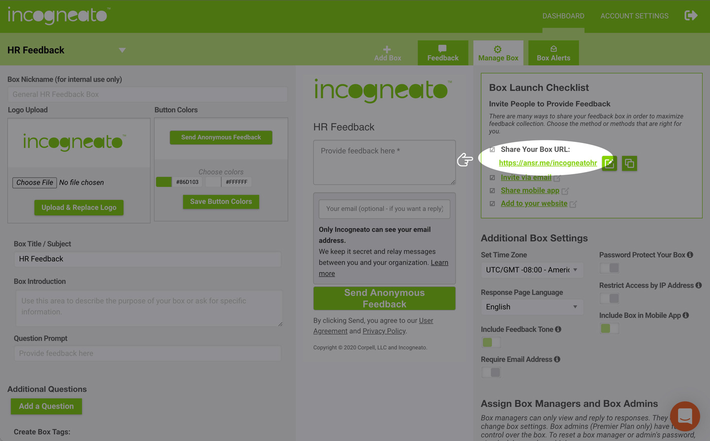 Login to your account, navigate to the Manage Box screen, and find the Share Your Box URL heading near the top of the Box Launch Checklist box. The web address of your box is displayed there and you may copy it by clicking the button with two squares on it.