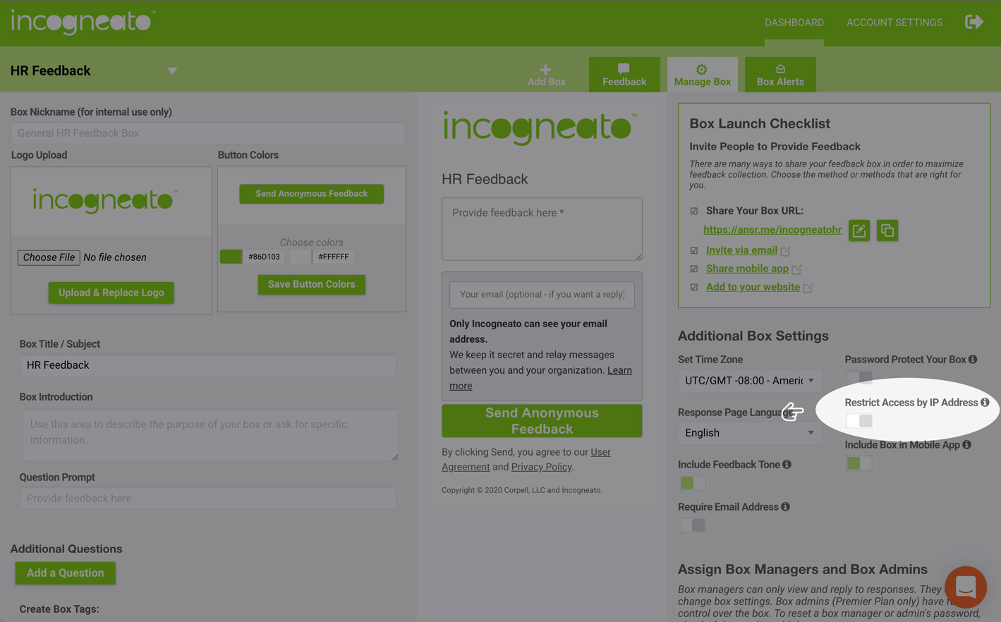 Log in to your account, navigate to the Manage Box screen, and find the Restrict Access By IP Address toggle. Clicking this will display an Add IP Address button that, when clicked, will provide a text field where you may enter an IP address. Once saved, you can add additional IP addresses and remove existing ones.